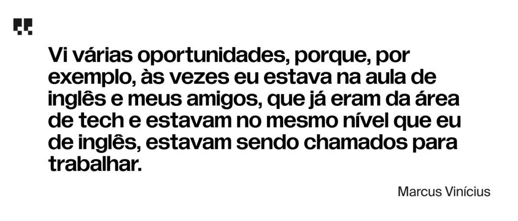 Lá, ele percebeu como os profissionais da área de tecnologia tinham mais facilidade para conseguir emprego, mesmo com um inglês básico. “Vi várias oportunidades, porque, por exemplo, às vezes eu estava na aula de inglês e meus amigos, que já eram da área de tech e estavam no mesmo nível que eu de inglês, estavam sendo chamados para trabalhar”, comenta.