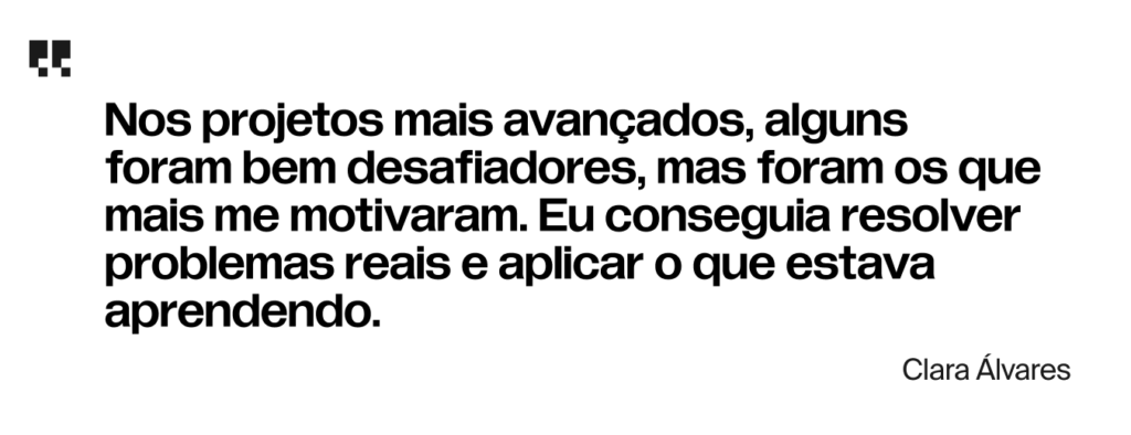 “Nos projetos mais avançados, alguns foram bem desafiadores, mas foram os que mais me motivaram. Eu conseguia resolver problemas reais e aplicar o que estava aprendendo.”