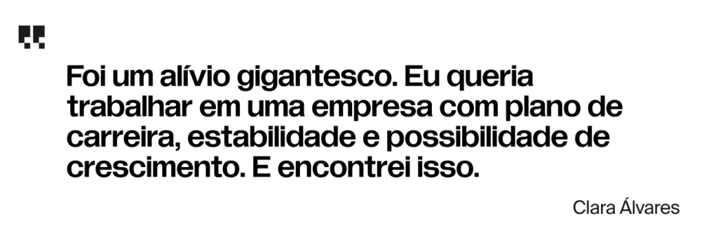 “Foi um alívio gigantesco. Eu queria trabalhar em uma empresa com plano de carreira, estabilidade e possibilidade de crescimento. E encontrei isso.”