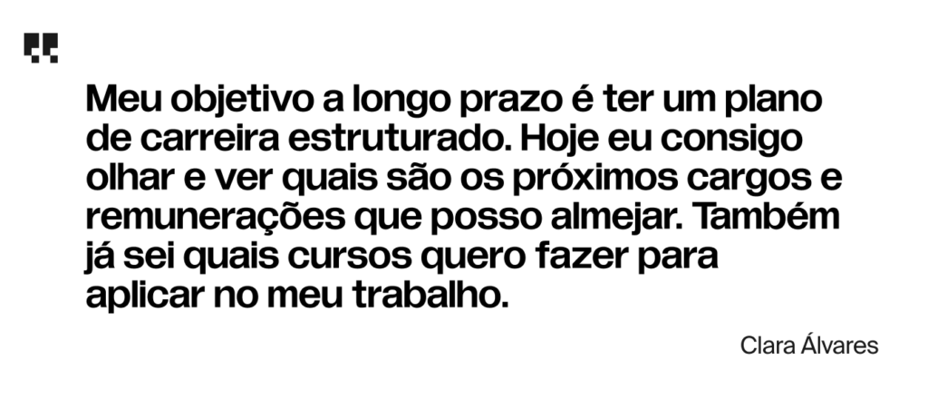 “Meu objetivo a longo prazo é ter um plano de carreira estruturado. Hoje eu consigo olhar e ver quais são os próximos cargos e remunerações que posso almejar. Também já sei quais cursos quero fazer para aplicar no meu trabalho.”