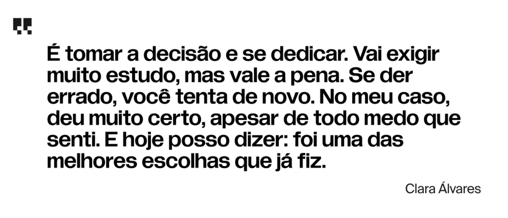 “É tomar a decisão e se dedicar. Vai exigir muito estudo, mas vale a pena. Se der errado, você tenta de novo. No meu caso, deu muito certo, apesar de todo medo que senti. E hoje posso dizer: foi uma das melhores escolhas que já fiz.”
