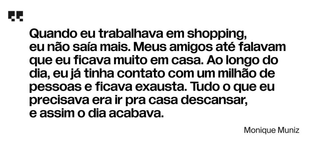 Sobre as vantagens do trabalho em casa, Monique confirma o que muitos já sabem: “Eu não preciso acordar tão cedo também, porque eu entro às nove. Eu posso acordar oito horas. Além disso, eu consigo fazer outras coisas depois do expediente. Até mesmo em casa, lavar roupa ou colocar o feijão para cozinhar na pressão. Não preciso me preocupar com esse negócio de preparar comida dias antes.”