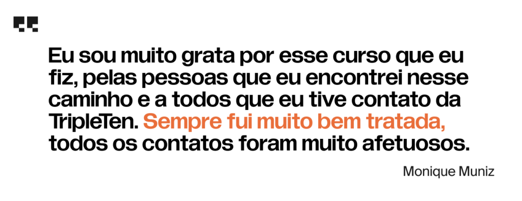 Mas Monique não desistiu. Durante uma pesquisa, encontrou a TripleTen. “Eu achei a TripleTen e vi que existiam os tutores e instrutores, que eles também, além da plataforma, estavam lá para você recorrer a eles, caso você não estivesse entendendo, caso você estivesse tendo algum tipo de dificuldade. E isso foi o que mais me empolgou, eu fiquei ‘caramba, eu acho que talvez é isso que eu preciso e não essas aulas já gravadas’”, conta.