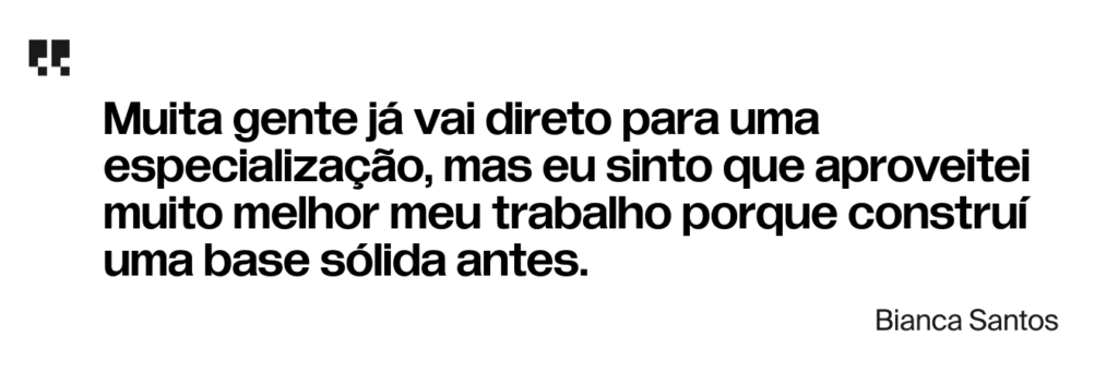 “Muita gente já vai direto para uma especialização, mas eu sinto que aproveitei muito melhor meu trabalho porque construí uma base sólida antes”.