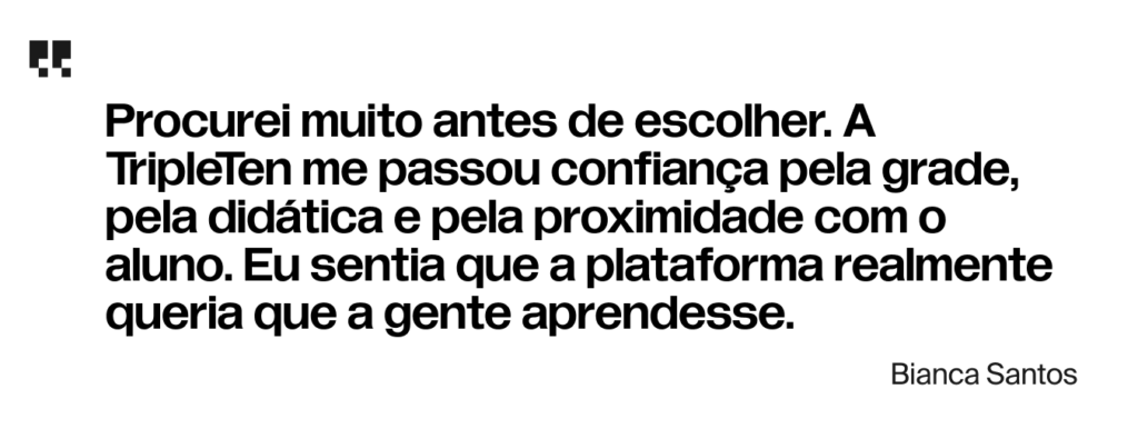 Antes da transição, Bianca sentia que estava parada no tempo. Embora o trabalho anterior tivesse propósito, a rotina era previsível e os desafios já não a impulsionavam mais. Com a TripleTen e o novo direcionamento profissional, o cenário mudou completamente.