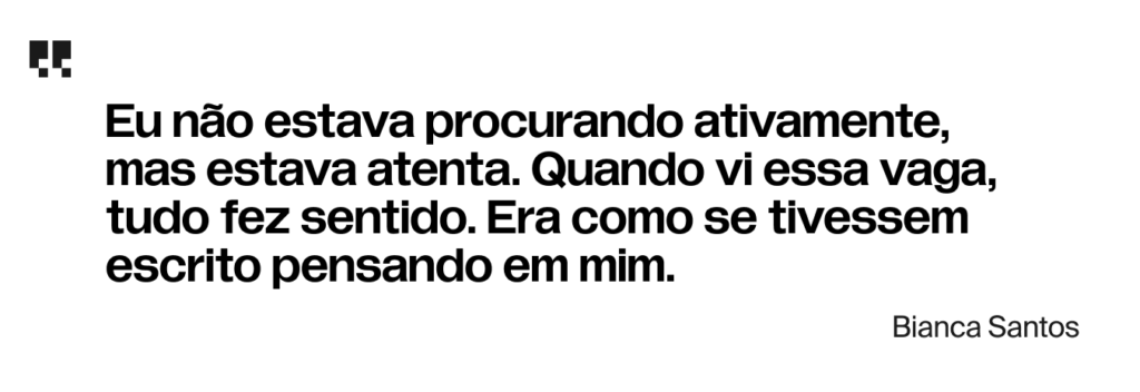 “Eu não estava procurando ativamente, mas estava atenta. Quando vi essa vaga, tudo fez sentido. Era como se tivessem escrito pensando em mim”.