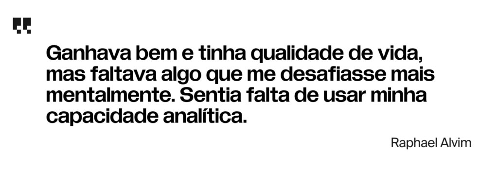 Apesar do conforto e da estabilidade financeira, surgiu uma inquietação intelectual. “Ganhava bem e tinha qualidade de vida, mas faltava algo que me desafiasse mais mentalmente. Sentia falta de usar minha capacidade analítica”, relembra.