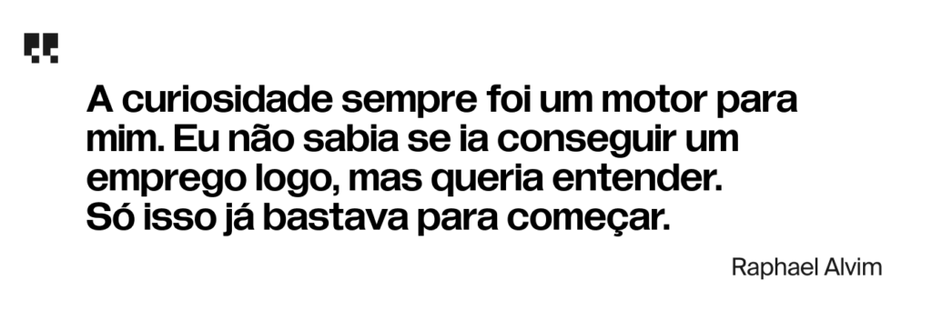 Foi nesse momento que a curiosidade falou mais alto. Raphael entendeu que adquirir conhecimento técnico era o caminho mais viável para alcançar seus objetivos. “A curiosidade sempre foi um motor para mim. Eu não sabia se ia conseguir um emprego logo, mas queria entender. Só isso já bastava para começar”.