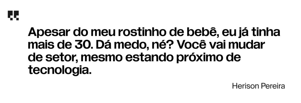 Aos 30 anos, a mudança de área trazia medos reais. Ele mesmo conta: “Apesar do meu rostinho de bebê, eu já tinha mais de 30. Dá medo, né? Você vai mudar de setor, mesmo estando próximo de tecnologia”.