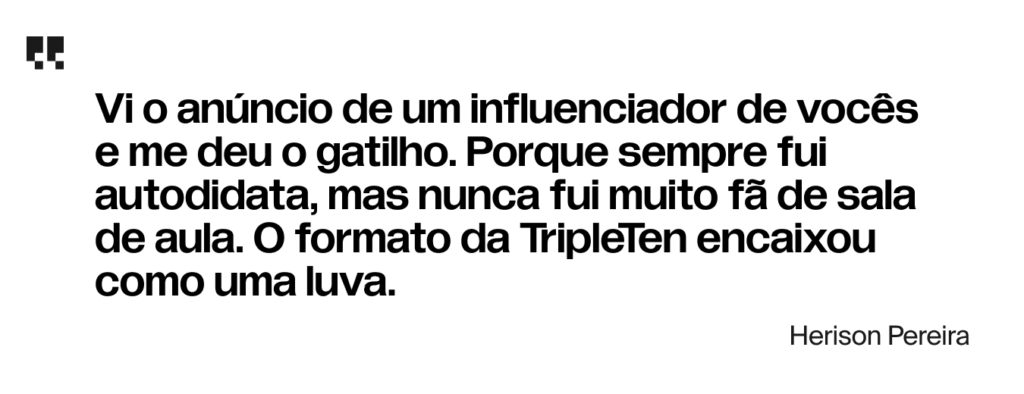 Para reinventar-se, Herison queria ir além da mesmice do mercado e, para isso, buscava por alternativas desafiadoras, mas igualmente flexíveis para o seu perfil autodidata. A resposta veio ao acaso, navegando no Instagram: “Vi o anúncio de um influenciador de vocês e me deu o gatilho. Porque sempre fui autodidata, mas nunca fui muito fã de sala de aula. O formato da TripleTen encaixou como uma luva”.