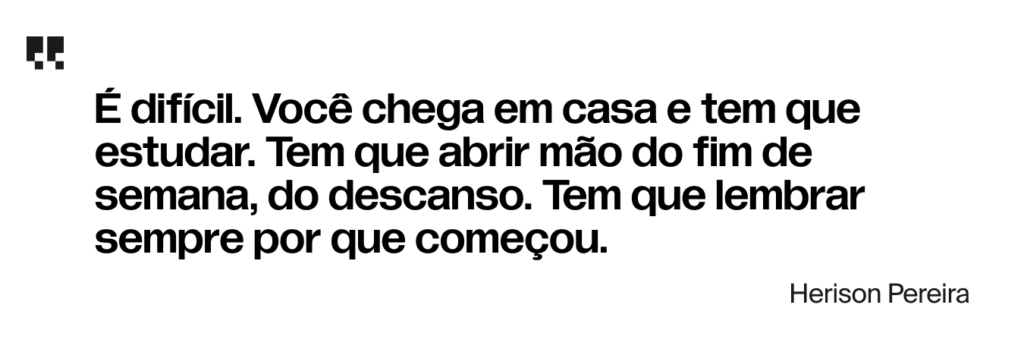 Conciliar estudos com a rotina puxada exigiu esforço contínuo. “Apesar de eu gostar muito de estudar, ainda assim era puxado. Tinha dia que batia o cansaço. Se você quiser, você não faz. E aí não progride”.
