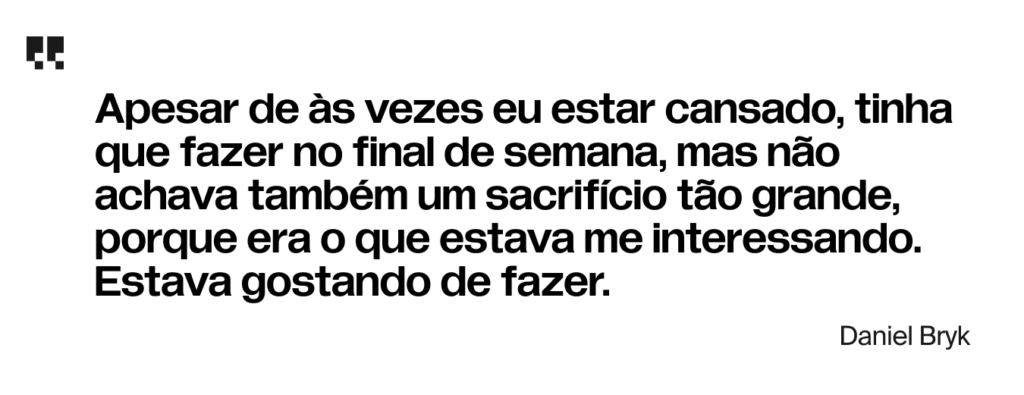 “Apesar de às vezes eu estar cansado, tinha que fazer no final de semana, mas não achava também um sacrifício tão grande, porque era o que estava me interessando. Estava gostando de fazer”, explica.