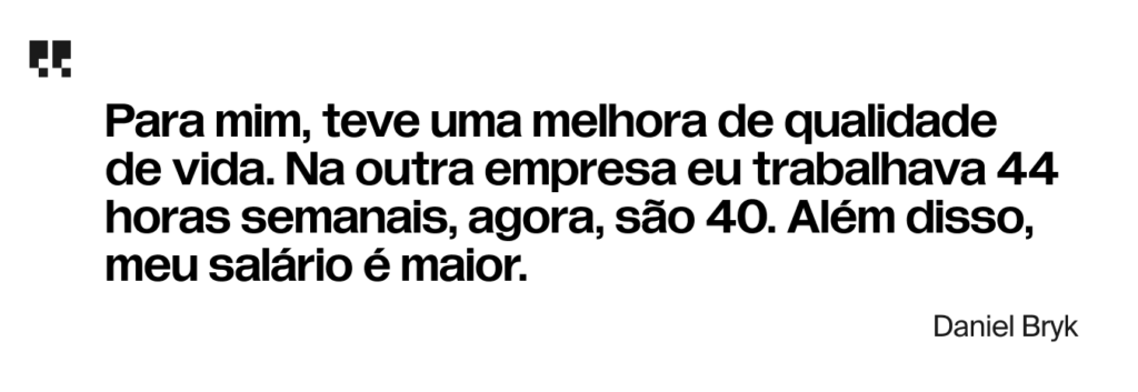 “Para mim, teve uma melhora de qualidade de vida. Na outra empresa eu trabalhava 44 horas semanais, agora, são 40. Além disso, meu salário é maior”.