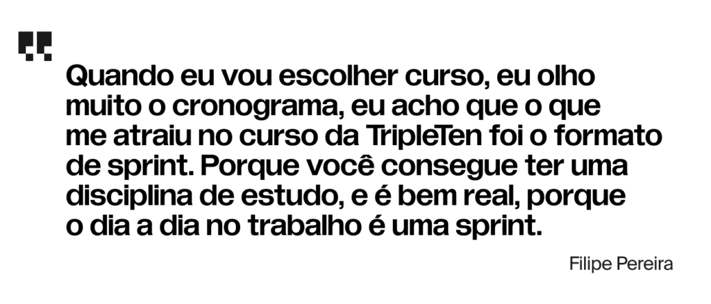 Já sobre o porquê da escolha, Filipe explica: “Quando eu vou escolher curso, eu olho muito o cronograma, eu acho que o que me atraiu no curso da TripleTen foi o formato de sprint. Porque você consegue ter uma disciplina de estudo, e é bem real, porque o dia a dia no trabalho é uma sprint.”, completa.
