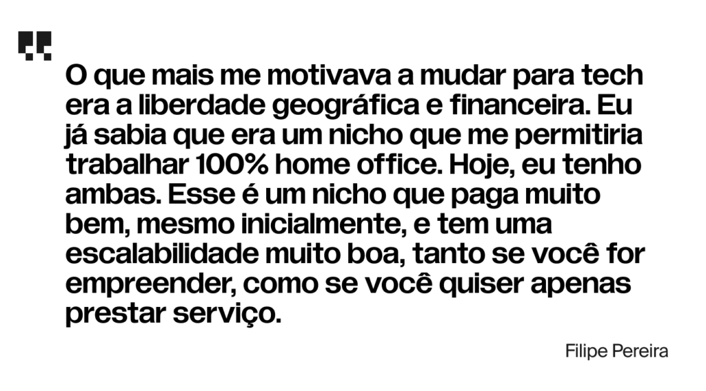 “O que mais me motivava a mudar para tech era a liberdade geográfica e financeira. Eu já sabia que era um nicho que me permitiria trabalhar 100% home office. Hoje, eu tenho ambas. Esse é um nicho que paga muito bem, mesmo inicialmente, e tem uma escalabilidade muito boa, tanto se você for empreender, como se você quiser apenas prestar serviço.”, conta o ex-aluno animado.